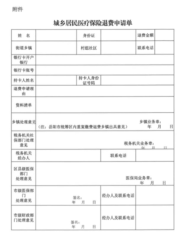 为规范岳阳市内及跨市城乡居民基本医疗保险费退费工作,进一步提升社保费征缴服务水平,根据《国家税务总局财政部中国人民银行人力资源社会保障部国家医疗保障局关于平稳有序做好社会保险费征管职责划转后征缴工作的通知》(税总发[2018]180号)规定,结合地区实际,就退费有关事项通知如下: