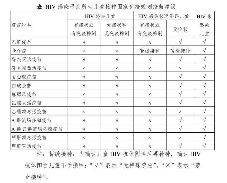 (五)非 HIV 感染母亲所生儿童,接种疫苗前无需常规开展 HIV 筛查。如果有其他暴露风险,确诊为 HIV 感染的,后续疫苗接种按照表中 HIV 感染儿童的接种建议进行。