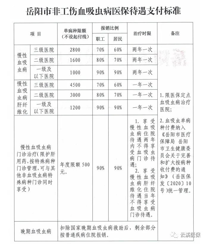 为保障参保人权益,规范非工伤血吸虫病医疗待遇,岳阳市医疗保障局近期下发了《岳阳市医疗保障局关于统一我市非工伤血吸虫病医保待遇支付标准的通知》,2022年1月1日起正式实施。