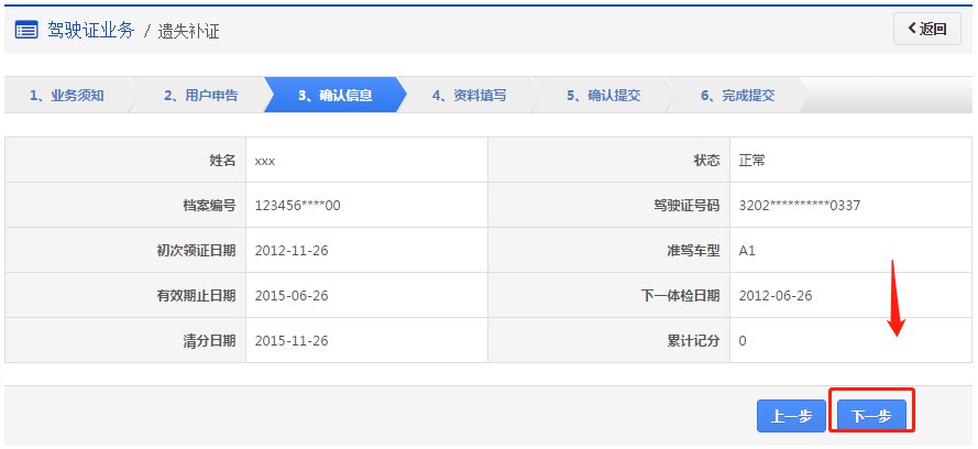 步骤3:【确认信息】在该步骤,界面显示驾驶证的基本信息,用户认真确认各项信息无误后,点击【下一步】进入步骤4【资料填写】。