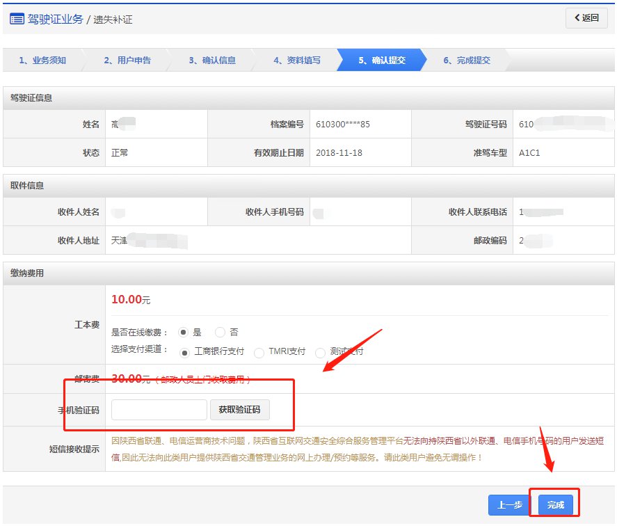 再次确认信息以后,点击【获取验证码】,系统会发送6位验证码到用户绑定的手机,用户输入手机验证码后,点击【完成】,进入步骤6【完成提交】。如果选择在线支付,提交后自动跳转至支付页面进行网上付款。