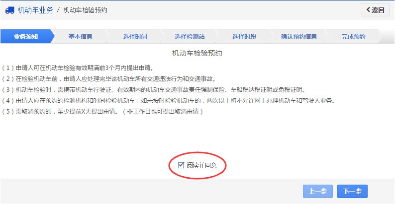 注:用户需要特别注意的下图中用红色椭圆标记的系统提示部分,其中包含了对取消预约的限制说明,预约未按期检验,用户将会被记入黑名单,影响其他互联网业务的办理。