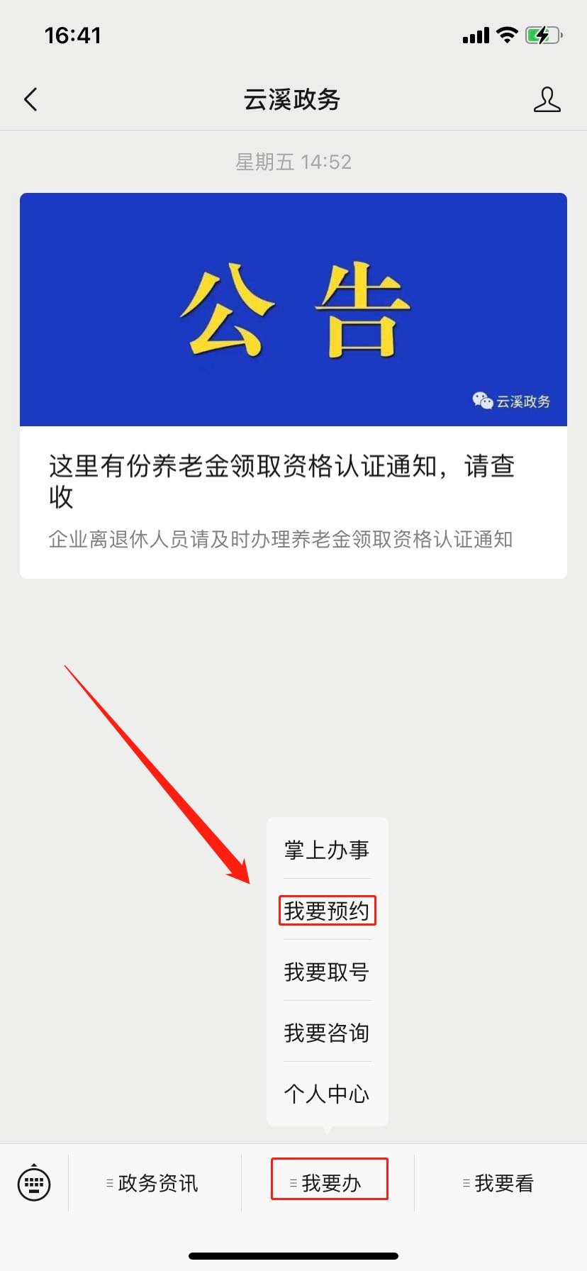 1、微信搜索并关注”云溪政务“。