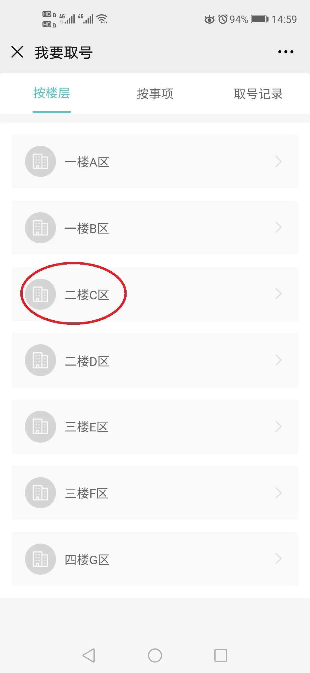 第三步:可根据自己的实际情况选择“按楼层”或者“按事项”进行现场取号。例如需要办理医疗住院报销业务,我们可以按楼层来取号,选择“二楼C区”,选择“医保局”,点击“综合受理窗口”即取号成功,我们的医保窗口业务还是实行无差别受理的哦!