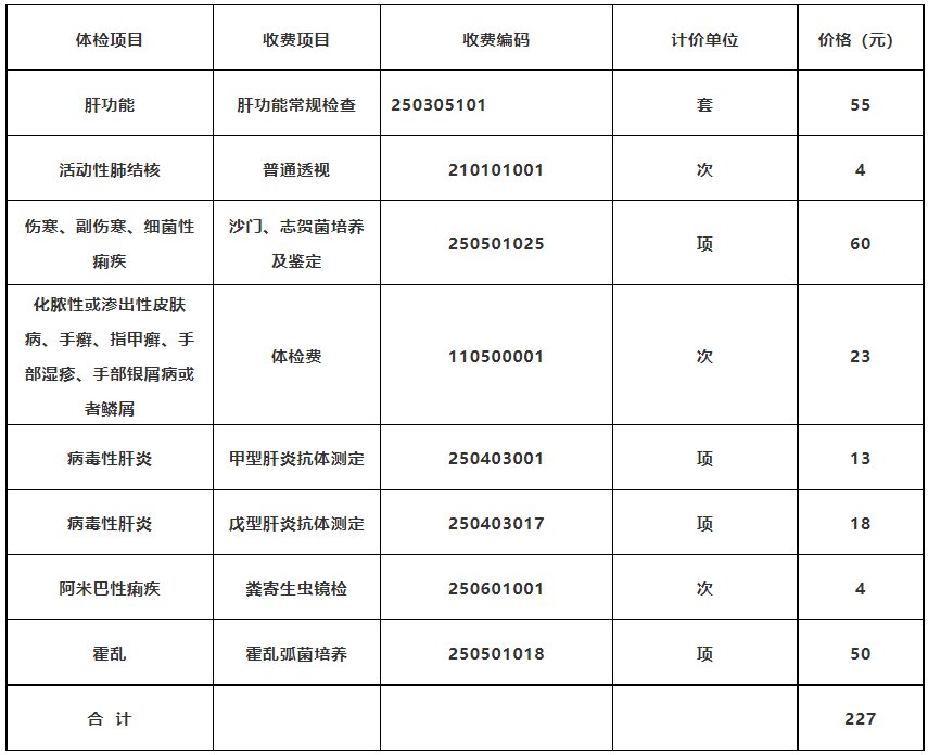 按照岳阳市现行医疗服务项目价格目录(2019修正版)的文件标准,从业人员健康检查可收取健康检查费227/人,为减轻企业和个人负担,我中心决定根据行业工作要求,商定必检项目,费用暂按95元/人收取检查成本费。
