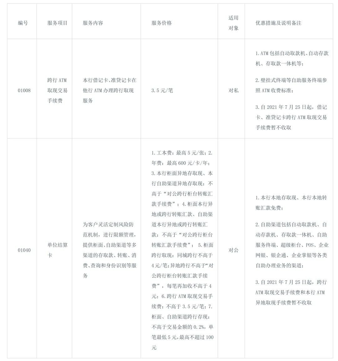 为落实中国银行业协会、中国支付清算协会《关于降低自动取款机(ATM)跨行取现手续费的倡议书》,持续减费让利,惠企利民,我行对《中国农业银行服务收费价格目录》中 “跨行ATM取现交易手续费”和“单位结算卡”服务项目的服务价格、优惠措施及说明备注进行调整,并于2021年7月25日零时生效。