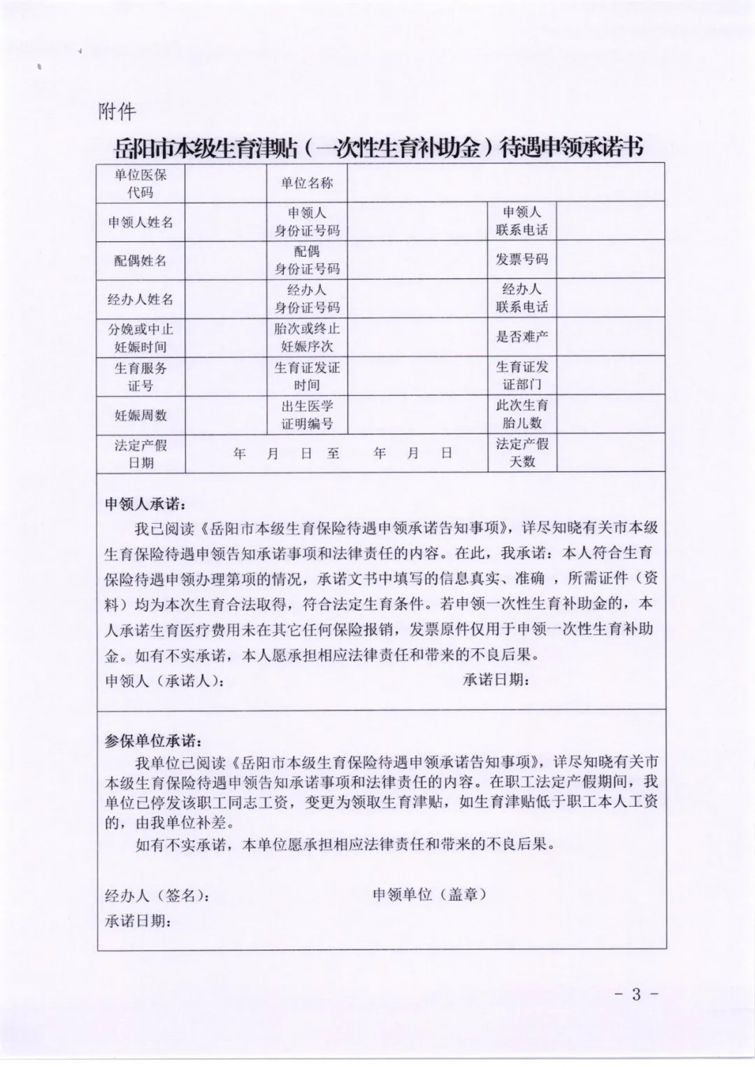 本次发布的《生育津贴和一次性生育补助金待遇申领实行承诺制办法》的通知明确,符合岳阳市生育津贴待遇享受政策,生育时在岳阳市连续缴纳生育保险费10个月以上,已完成生育医疗费用医保报销,分娩或中止妊娠一年内,均可以承诺制方式申领生育津贴;符合岳阳市生育补助金待遇享受政策,均可以承诺制方式申领生育补助金。