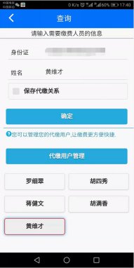 (1) 用户可以代人进行缴费,点击【代人缴费】,在代人缴费页面输入被代缴用户的身份证和姓名,点击【确认】后进入缴费查询界面。
