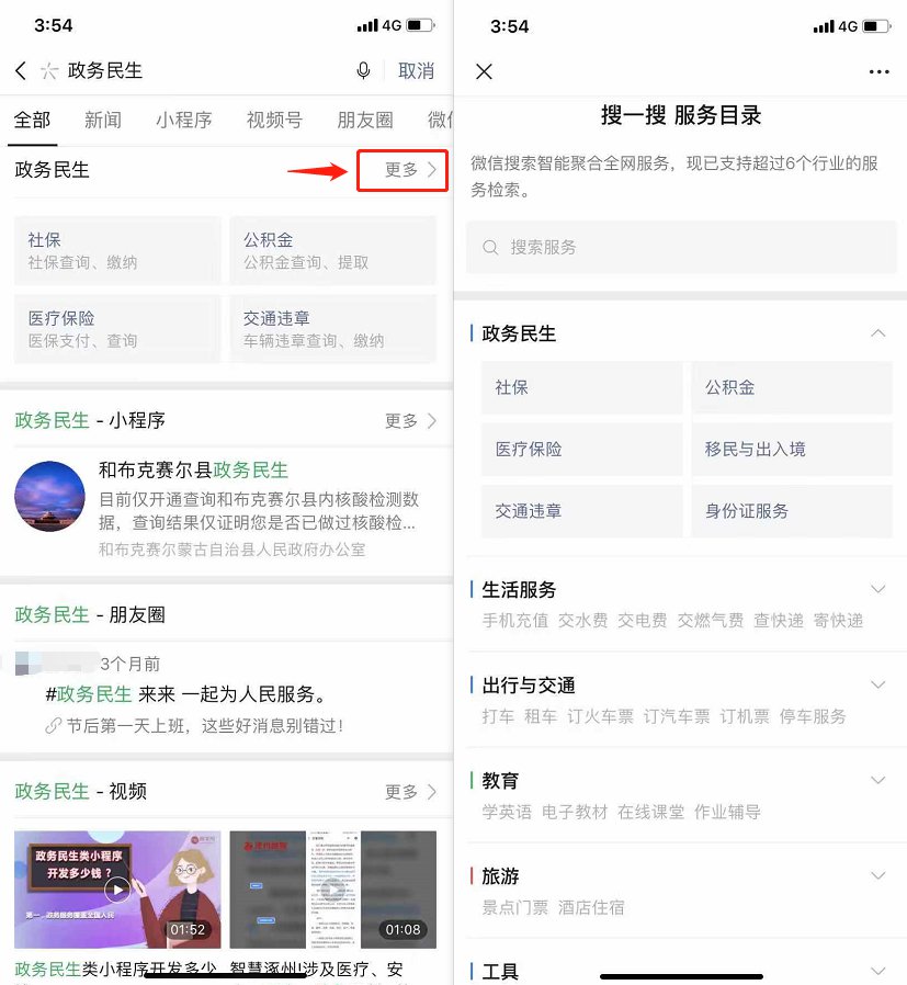 方法二:在微信搜索【政务民生】,还可以得到当地各类政务办事入口,如社保查询、公积金提取、违章处理等,方便快捷的在微信里办理或查询各类政务办事。