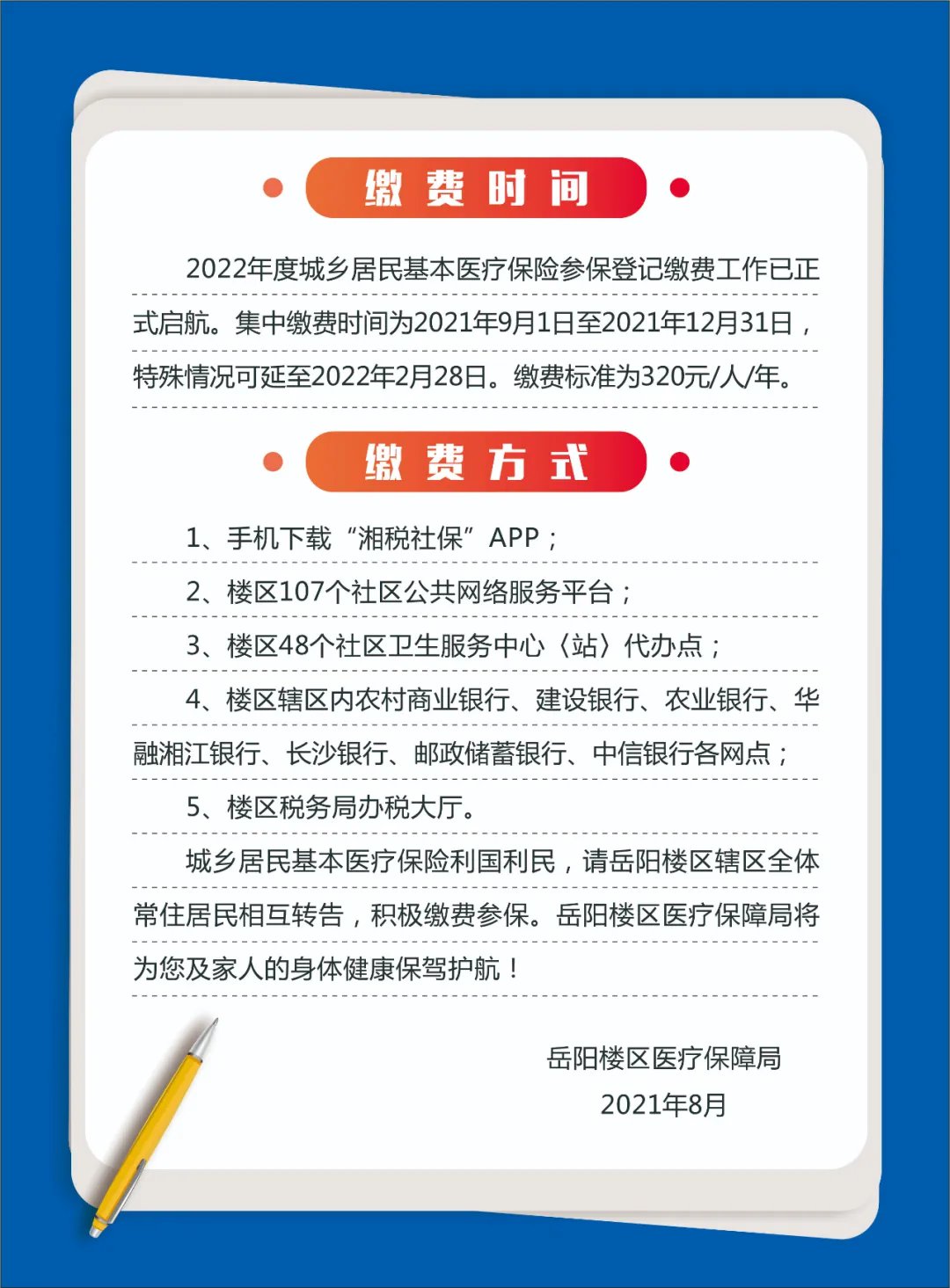 2022年度城乡居民基本医疗保险参保登记缴费工作已正式启航。集中缴费时间为2021年9月1日至2021年12月31日,特殊情况可延至2022年2月28日。缴费标准为320元/人/年。