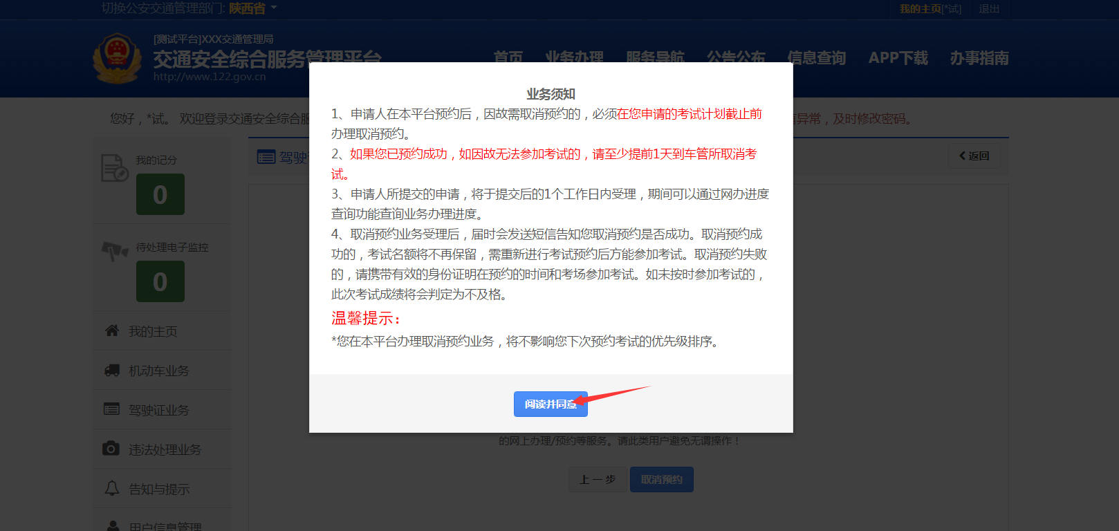在该步骤,用户需认真阅读其内容,包括:取消预约应注意的相关事项和相关责任,如下图所示。同意的,点击【阅读并同意】进入步骤3【确认取消】。