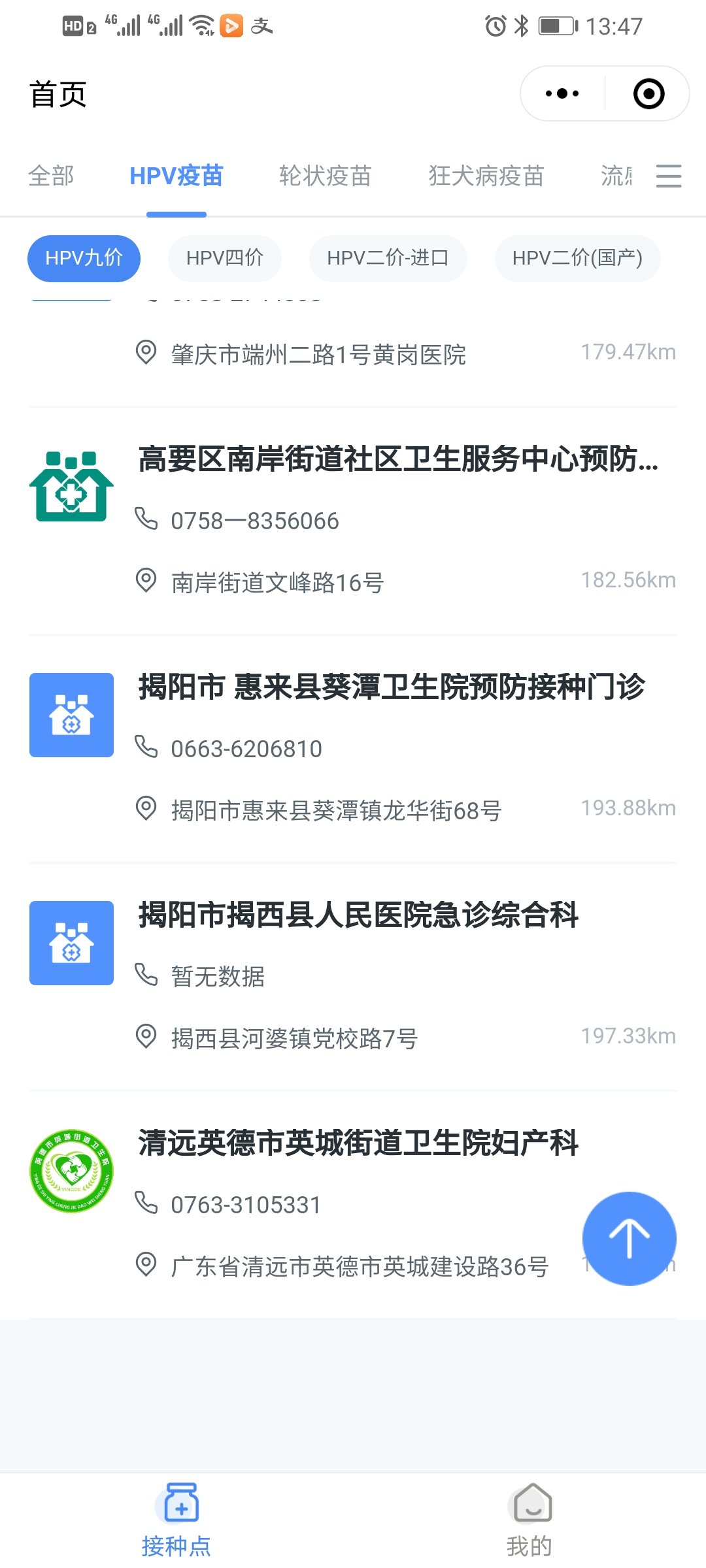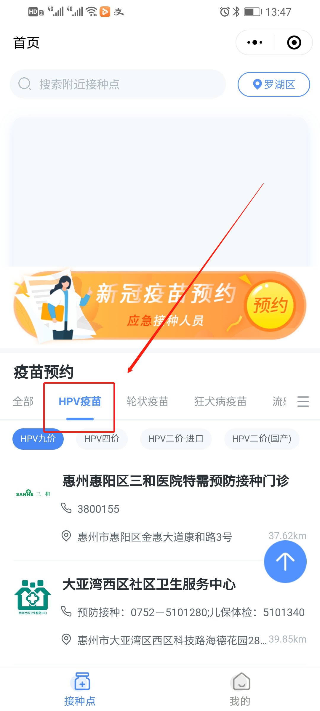 2、然后进入,点击接种点页面中的“HPV疫苗”(如下图所示);