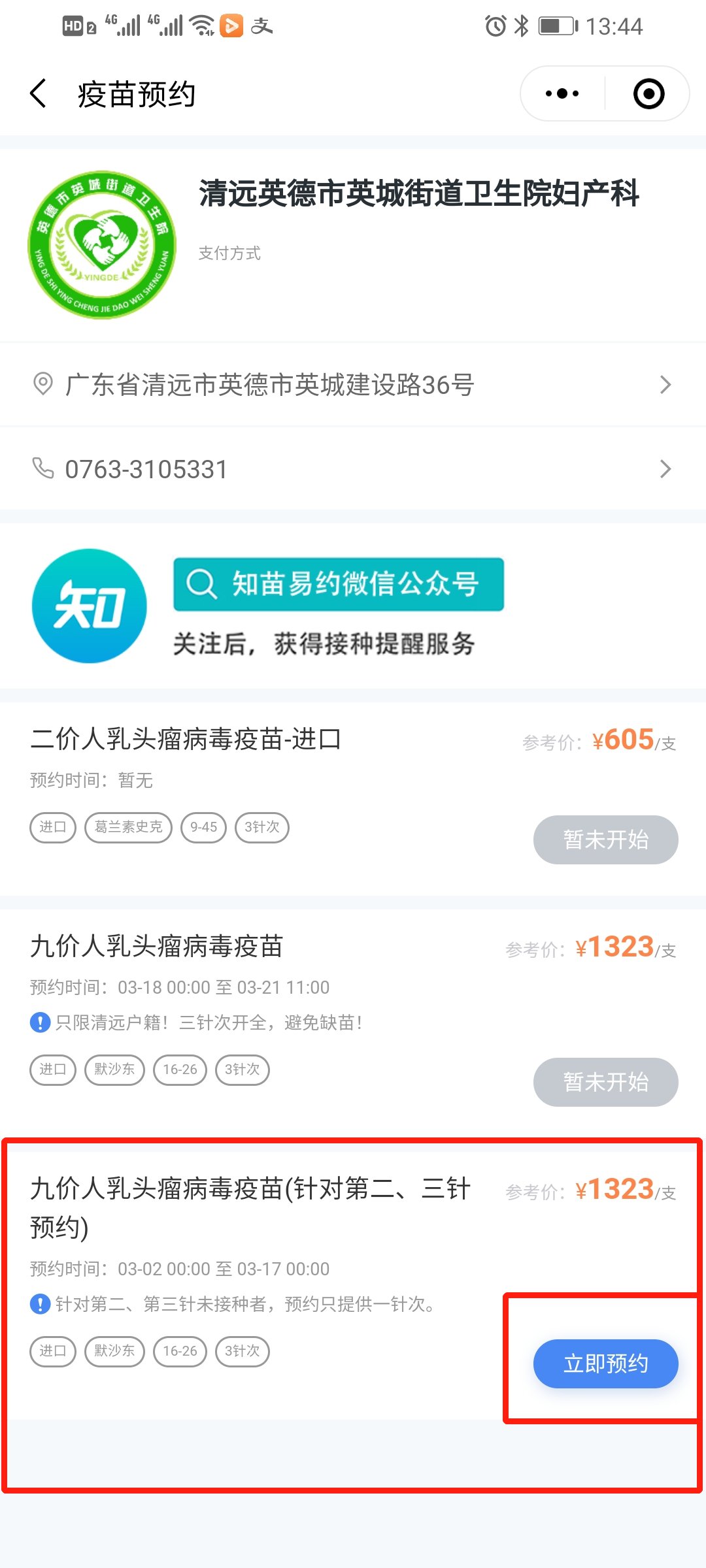 4、然后点击进入,选择九价疫苗,点击“立即预约”(如下图所示);