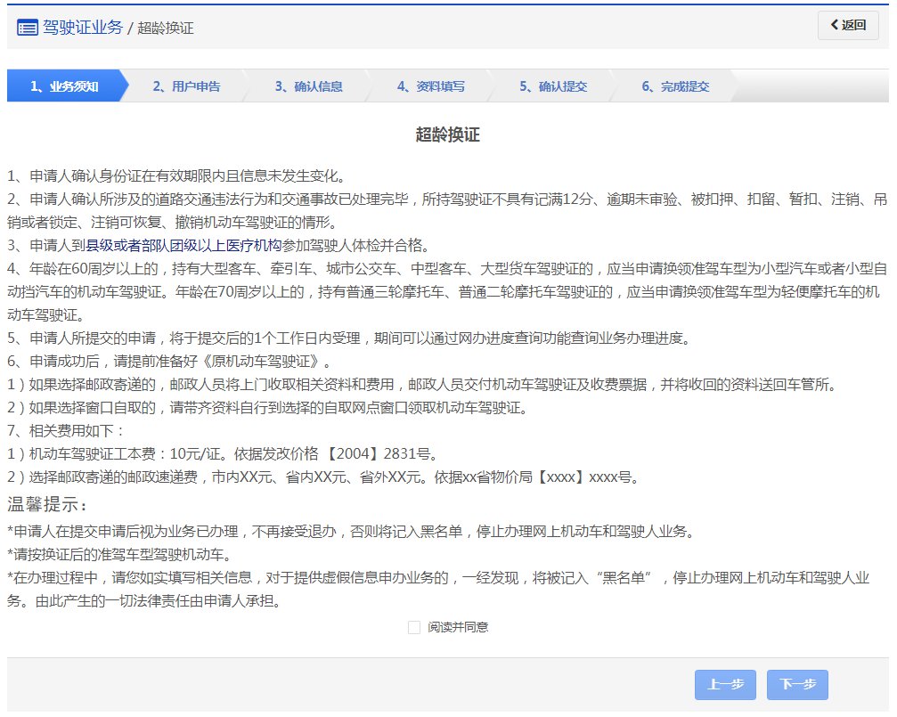 在该步骤,用户需认真阅读其内容,包括:办理超龄换证需要注意的各项内容和相关责任,如下图所示。同意的,勾选“阅读并同意”,点击【下一步】进入步骤2【用户申告】。