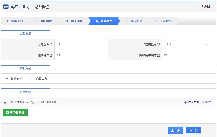 在该步骤,用户需认真确认降级后准驾车型,并且选择领取方式是邮政寄递或窗口自取。业务成功受理后,如果选择邮政寄递的,邮政人员将上门收取相关资料和费用,交付机动车驾驶证及收费票据,同时将收回的资料送回车管所。如果选择窗口自取的,则自行到选择的自取网点窗口领取机动车驾驶证。