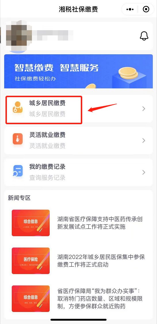 进入“湘税社保”小程序,登陆后在首页点击“城乡居民缴费”,填写证件类型、证件号码、姓名,选择“缴费险种-城乡居民医疗保险”,选择缴费年度,点击“下一步”,提交缴费完成即可。