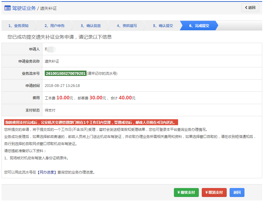 该步骤显示用户的驾驶证信息、领取详情以及需要缴纳费用信息,如果平台已开通在线支付功能,显示在线支付详情。