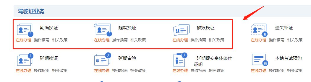 2、驾驶证业务-期满换证/超龄换证/损毁换证,点击“在线办理”