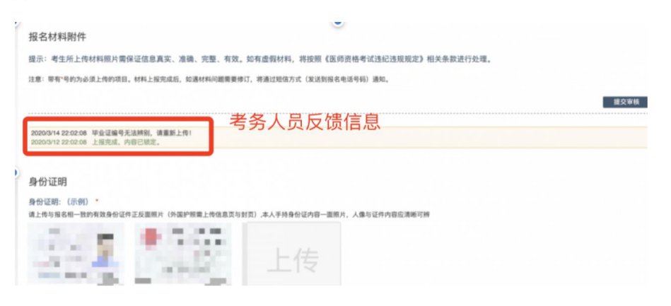考生可根据考区要求的时间或通知,登陆上传页面查看医师资格考试报名材料审核反馈意见,并根据反馈意见补充完善相关材料。
