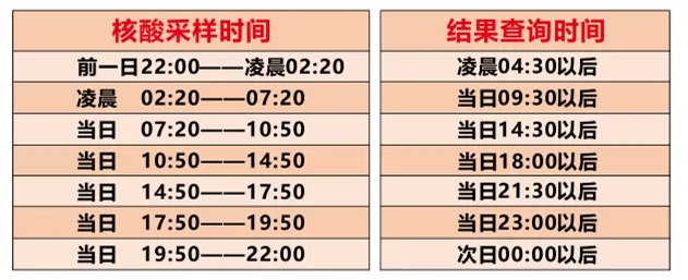 (1)无发热、无流行病字史人员(14天内来自中高风险区、有密切接触史、来自境外等)核酸采样时间: 8:00-22:00在核酸采样室②采样(放射科楼后,1号楼1楼,便民超市旁) ;