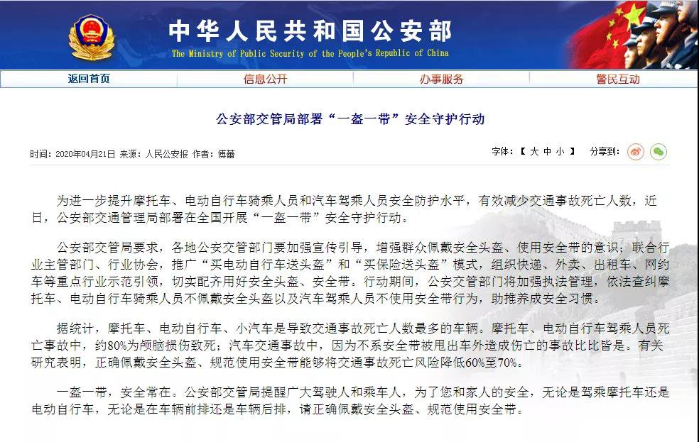 为进一步增强摩托车和电动车骑乘人员佩戴安全头盔、汽车驾乘人员使用安全带,按照公安部统一部署近日,全国交警部门将于6月1日起开展“一盔(头盔)一带(安全带)”安全守护行动,集中整治不戴头盔、不系安全带交通违法行为。