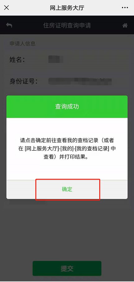 8、提交成功后,可以点击“确定”按钮,查看或打印结果。