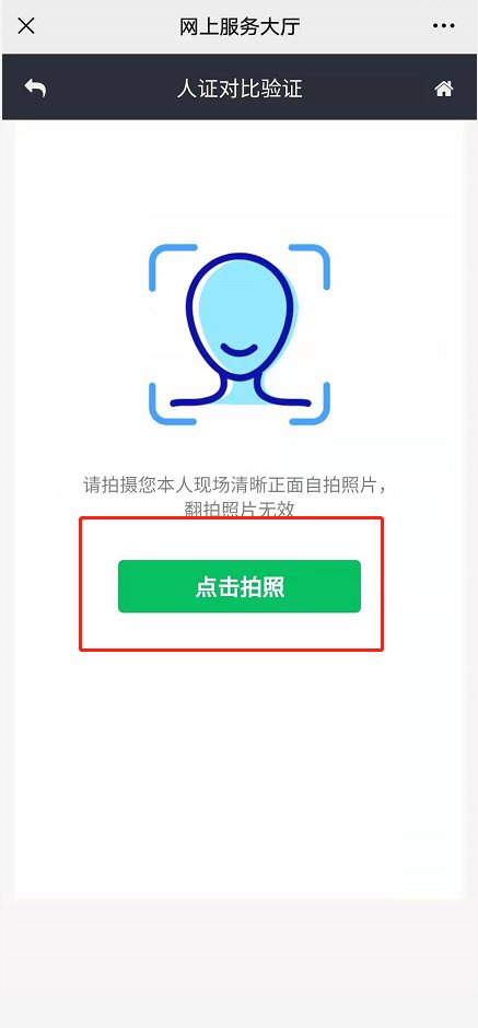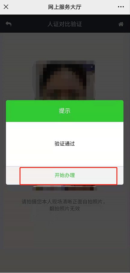 5、根据提示信息进行相关操作,点击拍摄本人正面照片(人证比对时应将帽子、围巾、眼镜、口罩摘掉,以防比对不通过),进行身份验证。身份验证通过后,点击“开始办理”按钮。