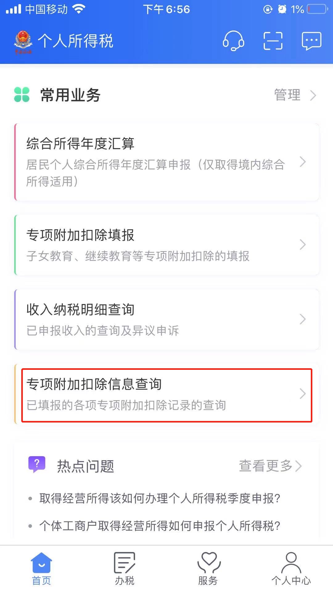 在首页依次点击【常用业务】-【专项附加扣除信息查询】,选择“2020年度”,可查看您已填报的专项附加扣除信息。