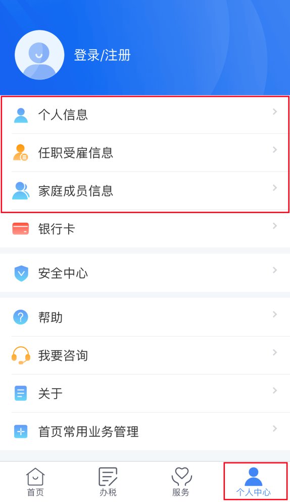 在【个人中心】模块下【个人信息】、【任职受雇信息】、【家庭成员信息】可分别查看和修改相应的基础信息。