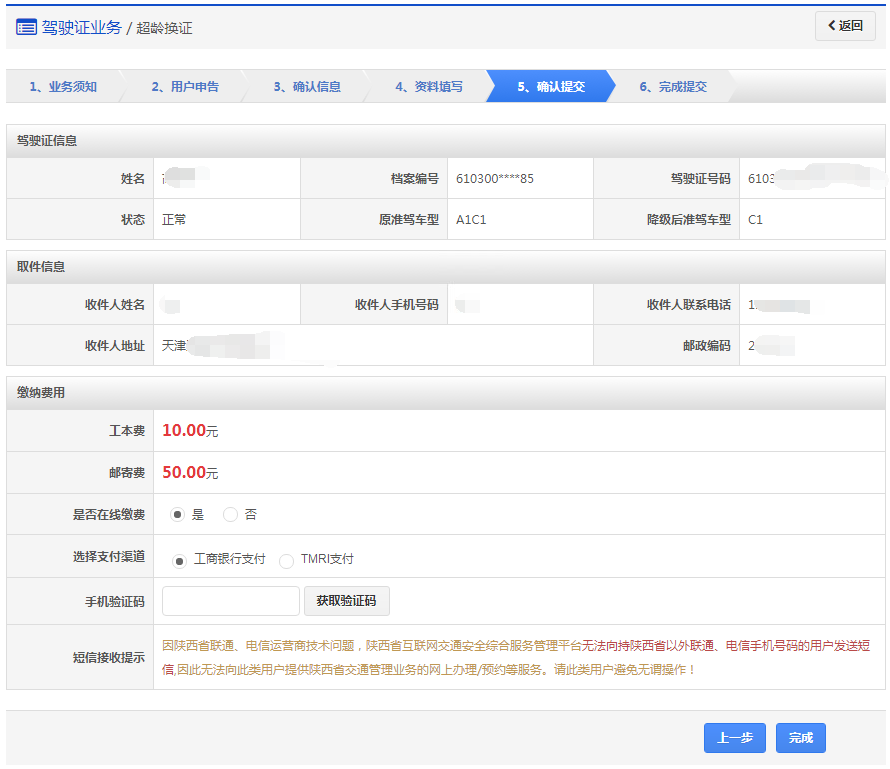 再次确认信息以后,点击【获取验证码】,系统会发送6位验证码到用户绑定的手机,用户输入手机验证码后,点击【完成】,进入步骤6【完成提交】。如果选择在线支付,提交后自动跳转至支付页面进行网上付款。