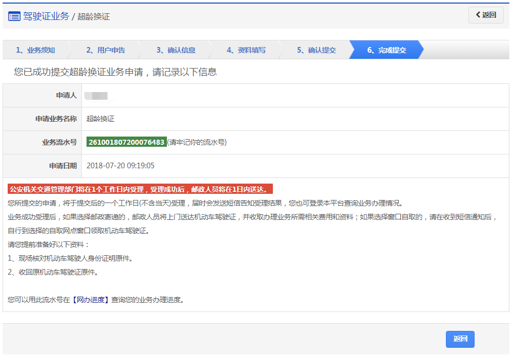 该步骤提交成功后,系统生成业务流水号。该步骤提交成功后,系统将于提交后的一个工作日(不含当天)受理(选择在线支付的业务费用支付完成后受理),届时会发送短信告知受理结果。用户可以根据该业务流水号在网办进度中查询业务办理进度。