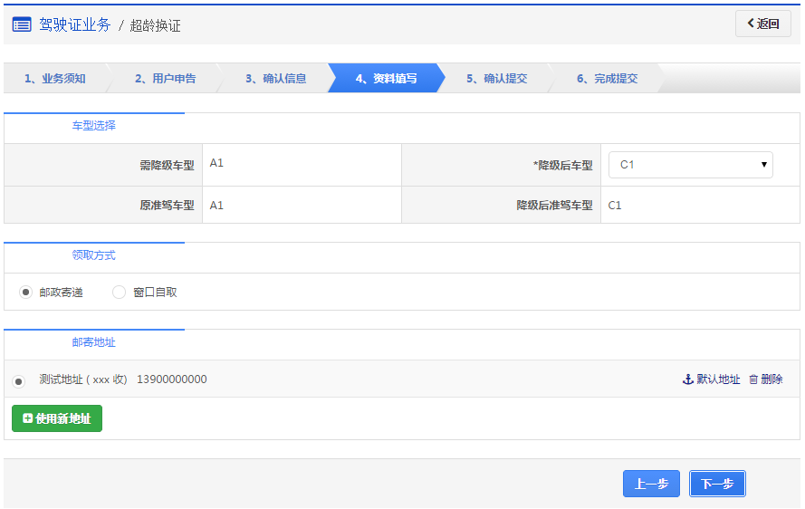 在该步骤,用户需认真确认降级后准驾车型,并且选择领取方式是邮政寄递或窗口自取。业务成功受理后,如果选择邮政寄递的,邮政人员将上门收取相关资料和费用,交付机动车驾驶证及收费票据,同时将收回的资料送回车管所。如果选择窗口自取的,则自行到选择的自取网点窗口领取机动车驾驶证。