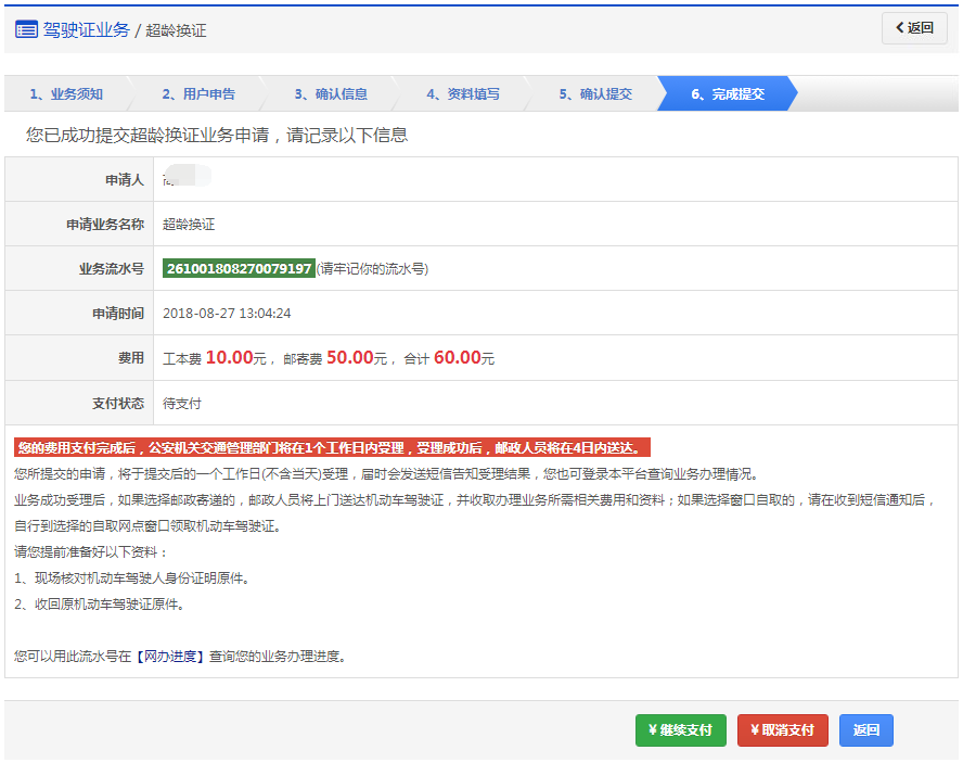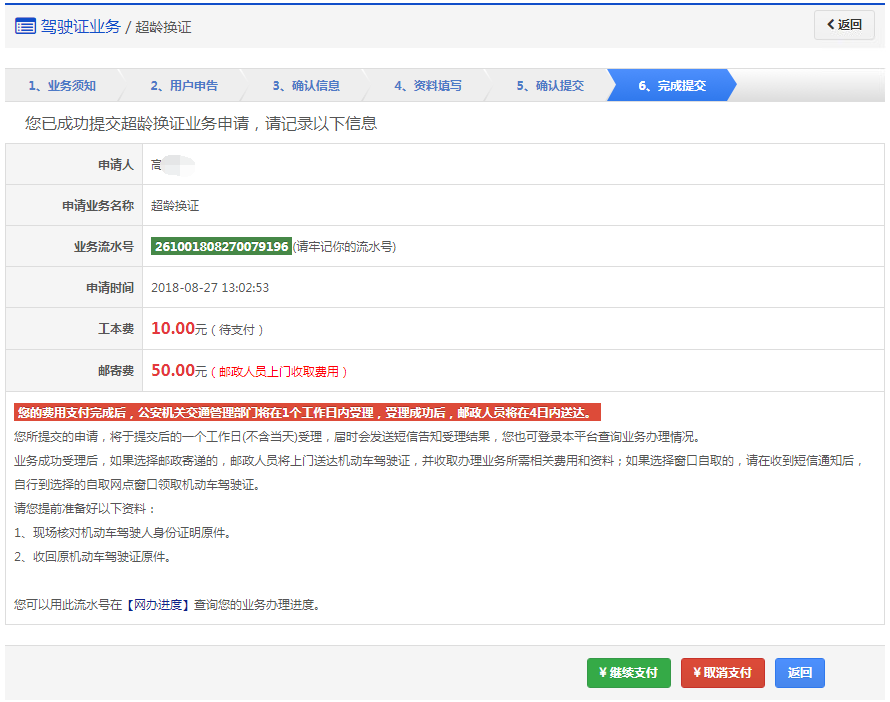 该步骤显示用户的驾驶证信息、领取详情以及需要缴纳费用信息,如果平台已开通在线支付功能,显示在线支付详情。