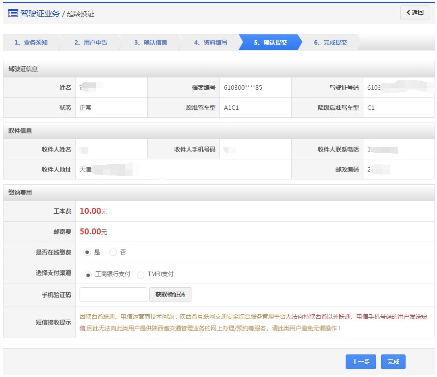 在该步骤,用户需认真确认降级后准驾车型,并且选择领取方式是邮政寄递或窗口自取。业务成功受理后,如果选择邮政寄递的,邮政人员将上门收取相关资料和费用,交付机动车驾驶证及收费票据,同时将收回的资料送回车管所。如果选择窗口自取的,则自行到选择的自取网点窗口领取机动车驾驶证。