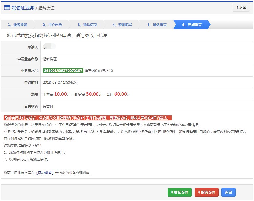 该步骤显示用户的驾驶证信息、领取详情以及需要缴纳费用信息,如果平台已开通在线支付功能,显示在线支付详情。