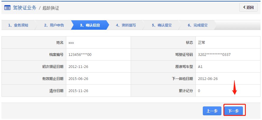在该步骤,界面显示驾驶证的基本信息,用户认真确认各项信息无误后,点击【下一步】进入步骤4【资料填写】。
