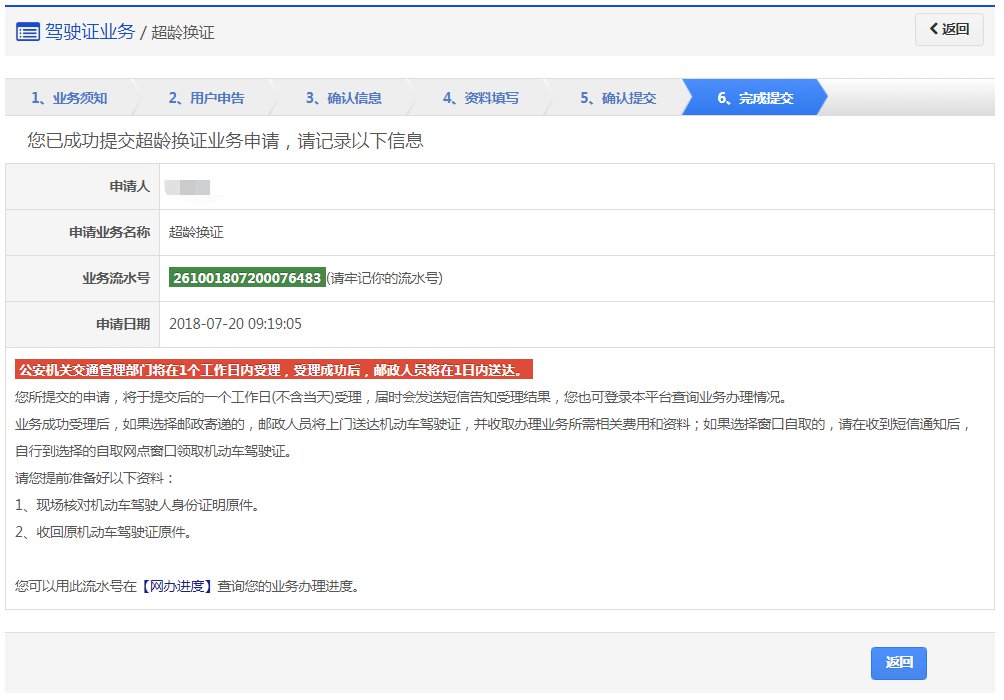 该步骤提交成功后,系统生成业务流水号。该步骤提交成功后,系统将于提交后的一个工作日(不含当天)受理(选择在线支付的业务费用支付完成后受理),届时会发送短信告知受理结果。用户可以根据该业务流水号在网办进度中查询业务办理进度。