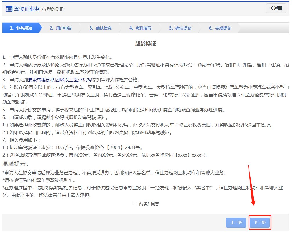 在该步骤,用户需认真阅读其内容,包括:办理超龄换证需要注意的各项内容和相关责任,如下图所示。同意的,勾选“阅读并同意”,点击【下一步】进入步骤2【用户申告】。