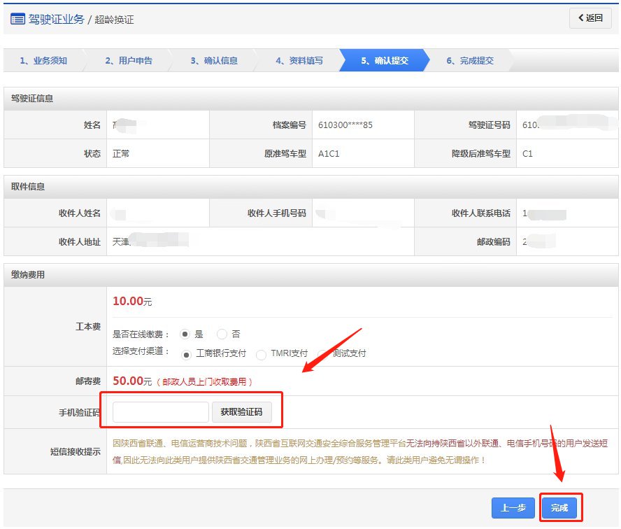再次确认信息以后,点击【获取验证码】,系统会发送6位验证码到用户绑定的手机,用户输入手机验证码后,点击【完成】,进入步骤6【完成提交】。如果选择在线支付,提交后自动跳转至支付页面进行网上付款。