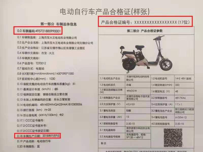 3、车辆的合格证编码:新国标电动自行车的合格证编码为17位