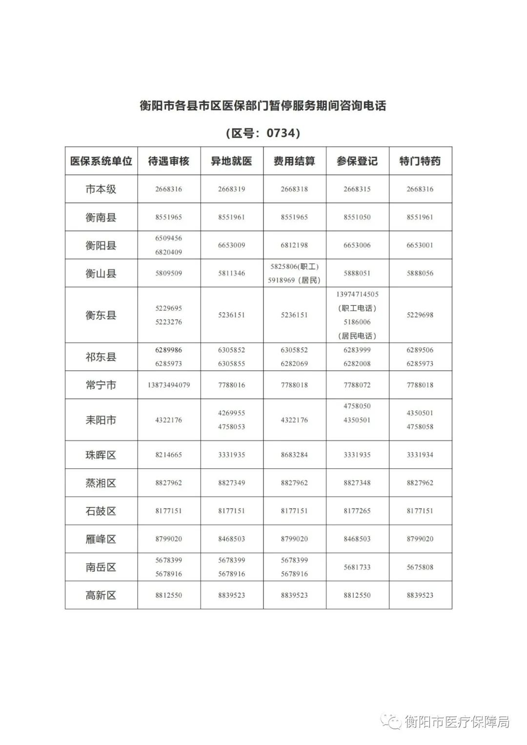 请大家关注我局官方微信公众号“衡阳市医疗保障局”,及时了解本次停机相关公告及最新信息。由此带来的不便,敬请参保单位、参保人谅解。如有疑问,请电话咨询当地医保部门(相关咨询电话附后)。
