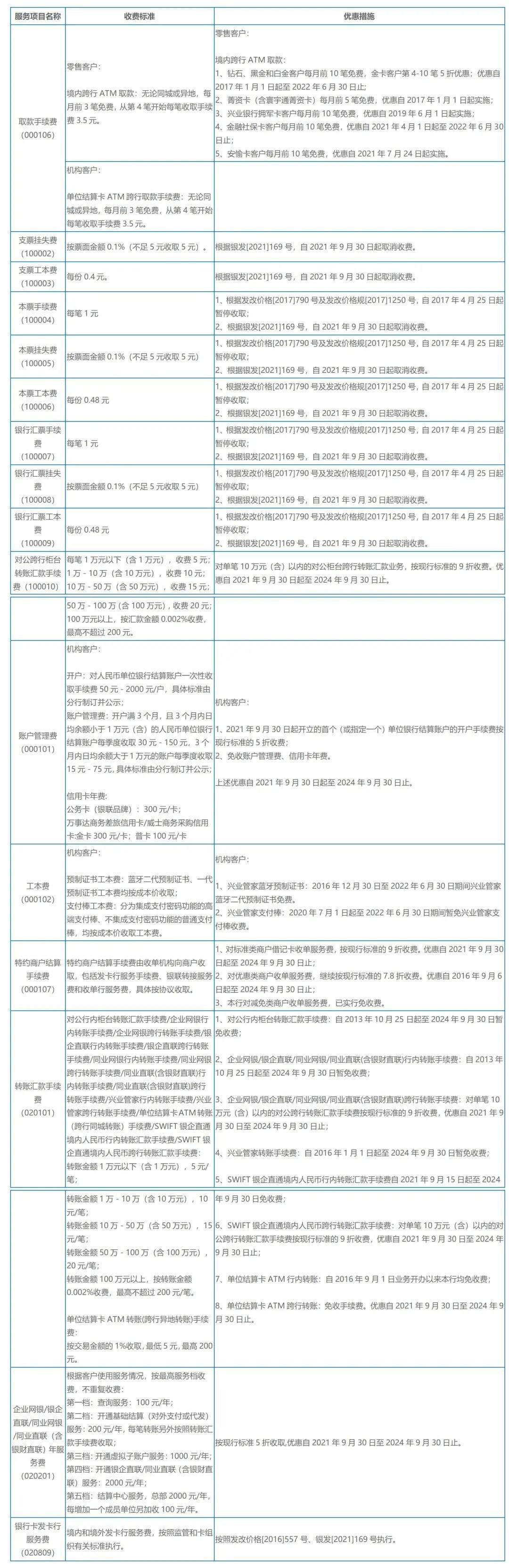 本行高度重视,严格落实、积极响应相关要求和倡议,积极履行社会责任,切实支持实体经济发展。现将涉及调整的服务项目收费标准与优惠措施公告如下:其中,跨行ATM取款收费标准自2021年7月24日起执行,预制证书与支付棒工本费收费标准自2021年9月30日起执行,其他项目优惠措施执行日期详见下表。