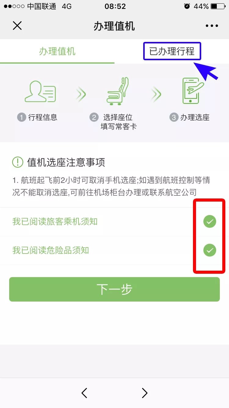阅读了相关须知后,填写证件信息、航班号后进行手机验证,然后就可以开始值机选座啦!(点击“已办理行程”即可查看办理完成后的电子登机牌和值机记录)