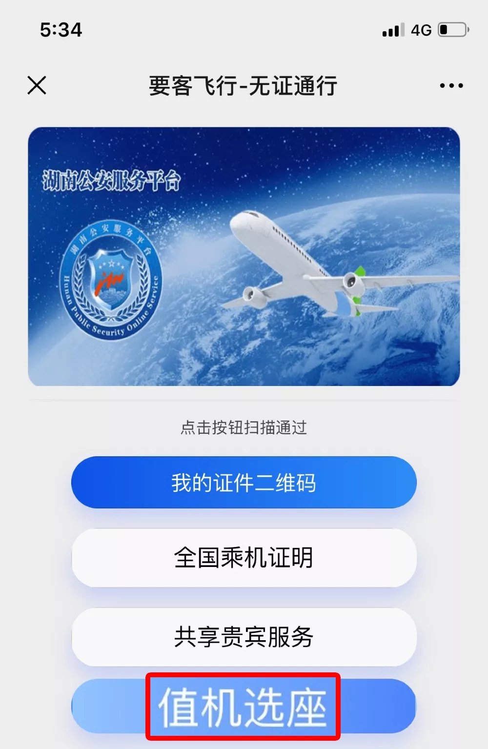 乘客用手机登录湖南公安服务平台后,进入【个人中心】,点击【电子证照】→ 【电子身份证】,再选择【电子证照登机】→【值机选座】