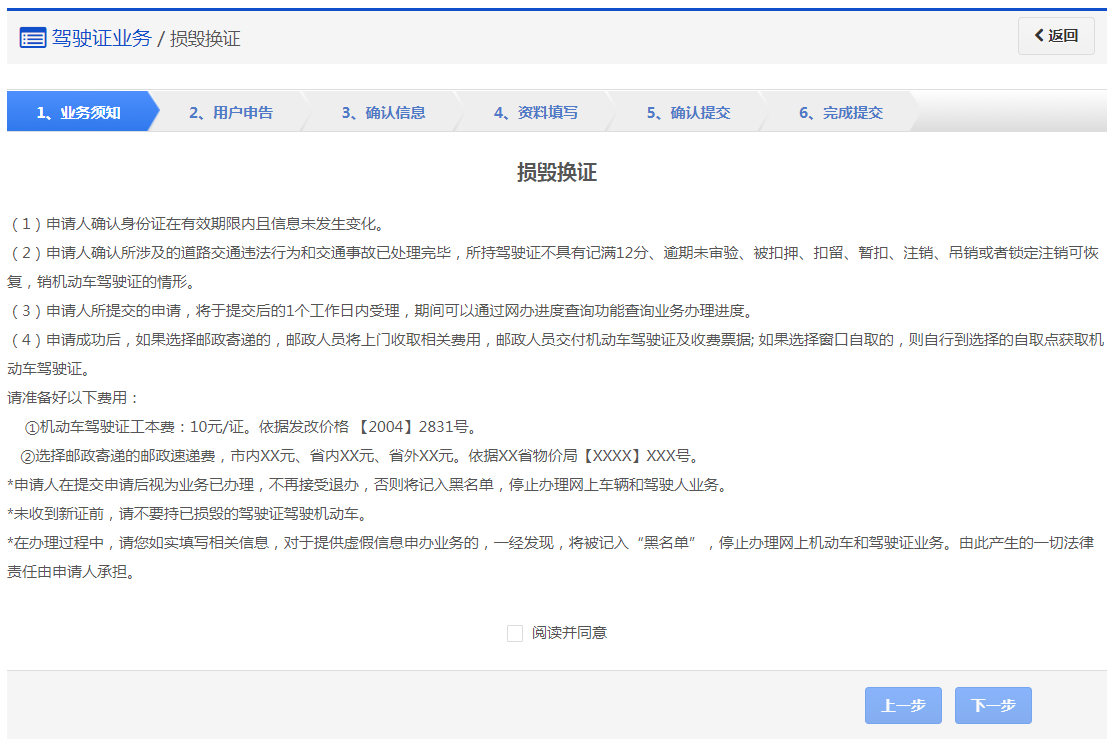 在该步骤,用户需认真阅读其内容,包括:办理损毁换证需要注意的各项内容和相关责任,如下图所示。同意的,勾选“阅读并同意”,点击【下一步】进入步骤2【用户申告】。