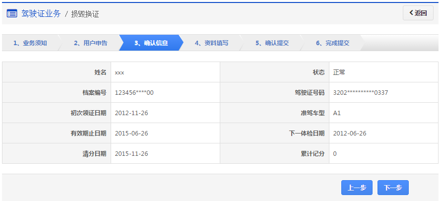 在该步骤,界面显示驾驶证的基本信息,用户认真确认各项信息无误后,点击【下一步】进入步骤4【资料填写】。