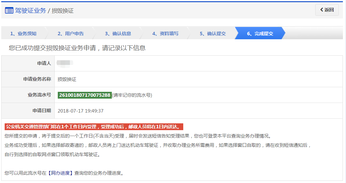 该步骤提交成功后,系统生成业务流水号。该步骤提交成功后,系统将于提交后的一个工作日(不含当天)受理(选择在线支付的业务费用支付完成后受理),届时会发送短信告知受理结果。用户可以根据该业务流水号在网办进度中查询业务办理进度。