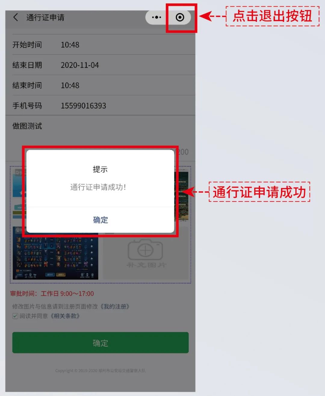 09弹出“通行证申请成功”申请操作完毕