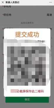 2、 填报成功后,请务必保存此二维码,可以使用手机截屏功能保存图片,或者长按二维码保存为图片。测体温时,将此二维码提供给工作人员,进行核验。