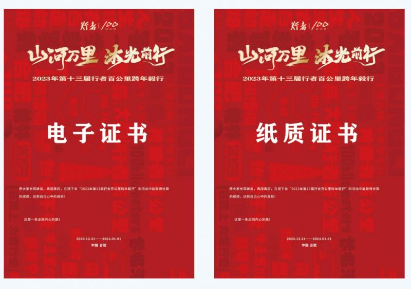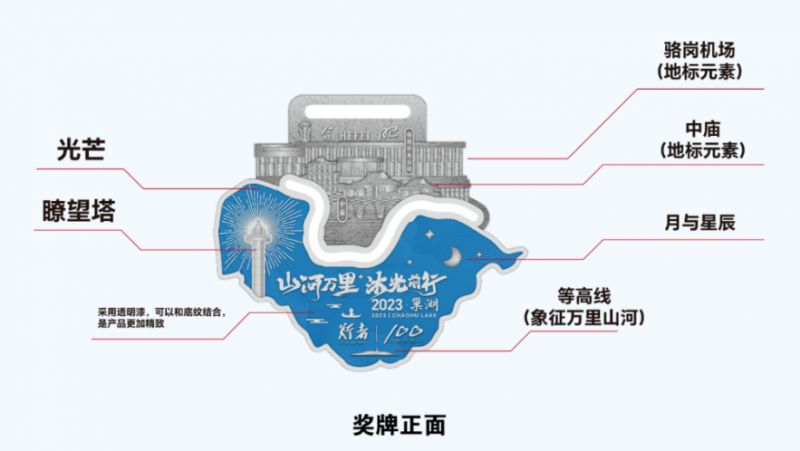 毅行奖牌以中国第五大淡水湖-巢湖为基础,采用了浮雕感极强的骆岗中央公园航站楼造型,它是合肥一步步走向世界的节点,也是世界上最大的城市公园,骆岗中央公园下方是“湖天第一胜境”的中庙景区,古今地标建筑的融合承载在“八百里巢湖”地图之上,充分展示了合肥的城市名片-大湖名城。奖牌背面则用细致雕刻展示出活动内容,加上激光雕刻的内容区域使每块奖牌都成为独一无二的纪念品。 巢湖内部加入了日月星辰的点缀,呼应了“山河万里、沐光前行”的百公里主题释义——在2023年的最后一天,毅行者沐浴着日光、月光、星光,踏上这条走回内心的路!本次活动采用了电子打卡以及线下打卡的形式,毅行者可在完成打卡后获得对应纪念证书。